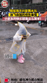 圖片來源:中國(guó)青年報(bào)視頻截圖 下雨天 一位萌娃穿著雨衣雨鞋 在水坑中興奮地 跑來跑去、跳來跳去