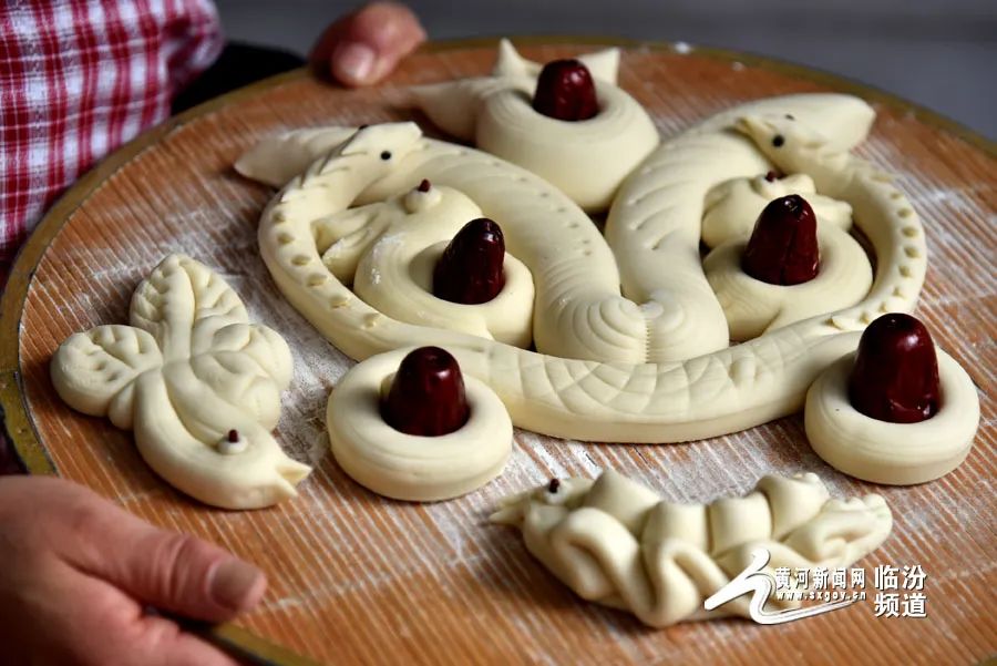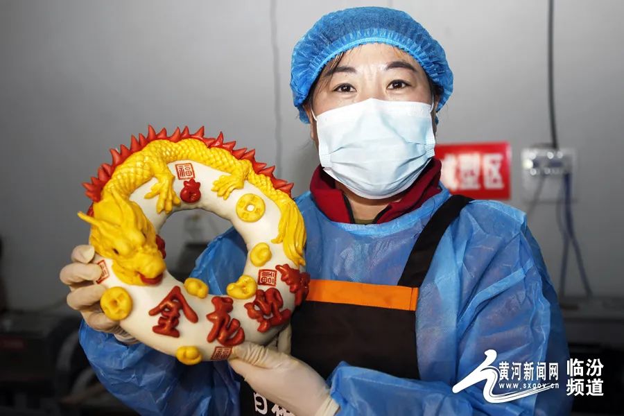 在晉南,蒸花饃是不可缺少的一項年俗?;x藝人用面粉、果蔬汁、雞蛋和牛奶等食材為原料,巧手捏制出“金龍迎春”“迎春納?!钡仍⒁饧榈南盗谢x,為即將到來的龍年春節(jié)增添了濃濃的年味。 “龍”剪紙