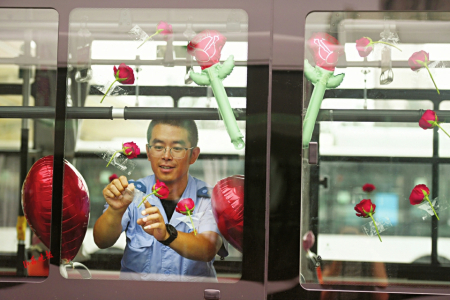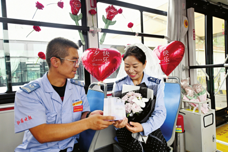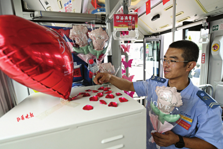 七夕節(jié)即將到來(lái),8月8日,在太原公交第三汽車分公司,公交車廂里上演了一場(chǎng)別樣的浪漫——堅(jiān)守在一線的兩名公交司機(jī)閻樹(shù)德和焦更新,分別為出車回來(lái)的妻子準(zhǔn)備了大大的驚喜。用送花、提前準(zhǔn)備飯菜、布置車廂等行動(dòng)表達(dá)自己的愛(ài)意。