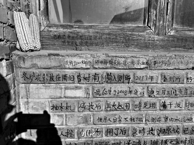 2024年春天,78歲的張福青過世了。那時(shí),環(huán)游中國(guó)的攝影師蔡山海,路過代縣上高陵村,恰巧碰上從外地趕回老家的張宏剛、張宏英為剛過世的父親舉行葬禮。他被葬禮上的鑼鼓聲吸引,走進(jìn)院子時(shí),卻被寫滿院子的文字震撼到。隨后,蔡山海用相機(jī)拍下那些寫在紅磚墻、木門窗上的文字,并發(fā)在“小紅書”上,隨即走紅網(wǎng)絡(luò)。