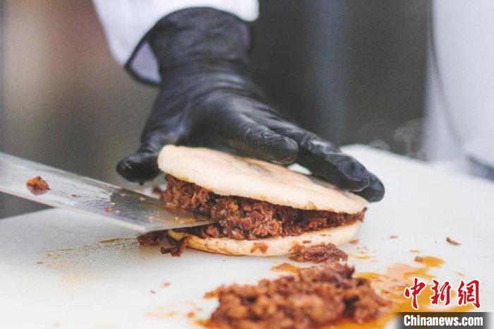 在意大利米蘭華人街,一家中國小吃店門前排著長(zhǎng)隊(duì)。玻璃櫥窗后的操作間里,廚師撈出剛煮好的臘汁肉,切成肉燥,現(xiàn)烙的白吉饃從中切開,填入肉燥后再淋上肉汁,這饃酥肉香的肉夾饃,吸引食客們?cè)诼愤叴罂於漕U。