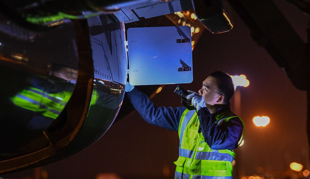 1月11日,在??诿捞m國際機(jī)場停機(jī)坪上,南航工程技術(shù)分公司機(jī)務(wù)工程師對飛機(jī)進(jìn)行深度檢查。新華社記者 楊冠宇 攝