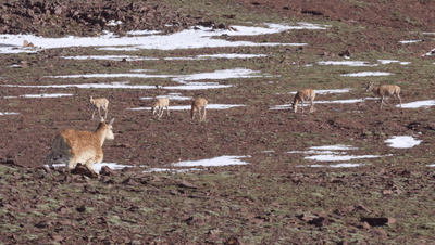 突然,離記者最近的一群藏羚羊旁邊,出現(xiàn)了一只步履稍顯僵硬的“藏羚羊”,腳步?jīng)]有那么輕盈,體型也更豐滿一些。不像其它藏羚羊一邊啃草一邊走動,這只“藏羚羊”一直昂著頭,“小心翼翼”卻又堅定執(zhí)著地一點點靠近藏羚羊群。