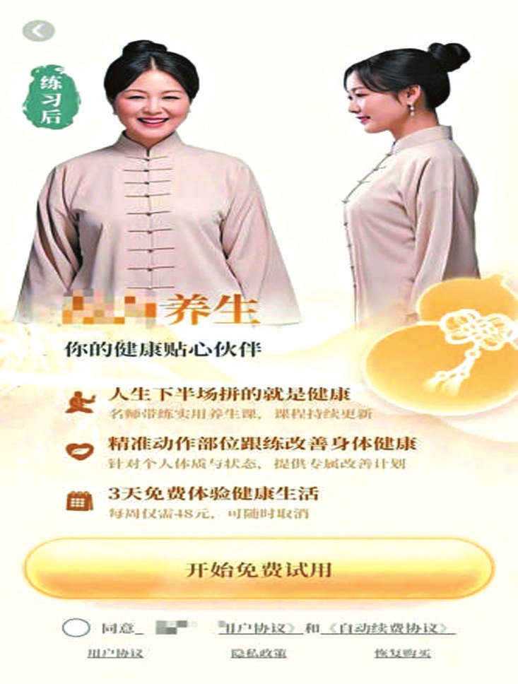 還有些App則更加離譜,下載完成后,點進(jìn)去的第一步就是要購買會員,之后才能正常使用。但在購買流程上,平臺卻耍起了花招。比如一款提供“養(yǎng)生指導(dǎo)服務(wù)”的App,頁面上會有一個大大的按鈕,寫著“開始免費(fèi)試用”。但在按鈕的旁邊,卻有一行非常不起眼的小字:“每周僅需48元,可隨時取消?!倍坏┯脩酎c擊開始試用,系統(tǒng)就會跳轉(zhuǎn)到自動續(xù)費(fèi)的開通界面。如果是辨別能力差的老人,可能還以為是在填寫什么注冊信息。