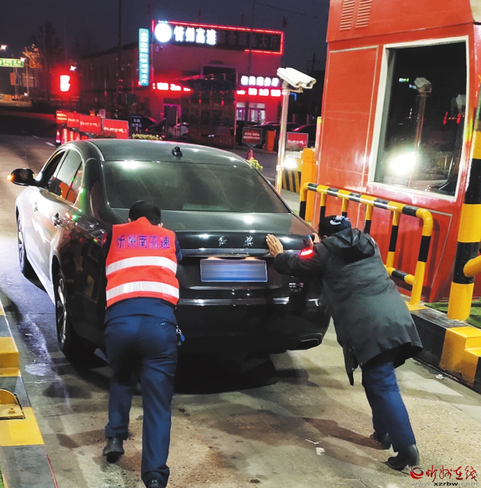 1月3日,南高速忻州收費(fèi)站出口駛?cè)胍惠v黑色紅旗小客車,在起步離開時(shí)車輛突發(fā)故障無法正常駛出車道。值班班長(zhǎng)得知后在安慰司乘人員情緒的同時(shí),立即組織工作人員一起將車推出收費(fèi)車道停放至安全區(qū)域,并擺放好隔離墩,防止事故發(fā)生,同時(shí)積極為司機(jī)聯(lián)系附近修理廠,安排維修人員前來維修。( 李瑞軍 莊新華 攝影報(bào)道)