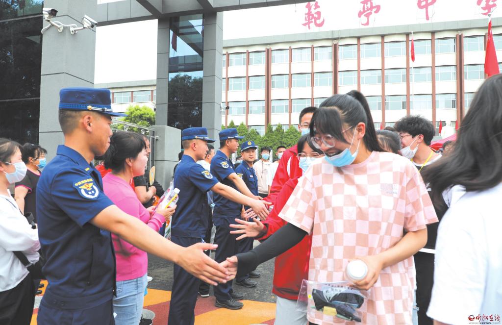 6月7日,全國高考開考,原平市2670名考生走進考場,經(jīng)歷人生中的一次大考??忌诳紙錾险J真答卷,社會各界營造良好的考試環(huán)境,為考生保駕護航。圖為在原平市范亭中學考點,考生完成首場考試后走出考場,消防救援工作人員與他們擊掌,為他們鼓勁加油。(褚 震 攝)