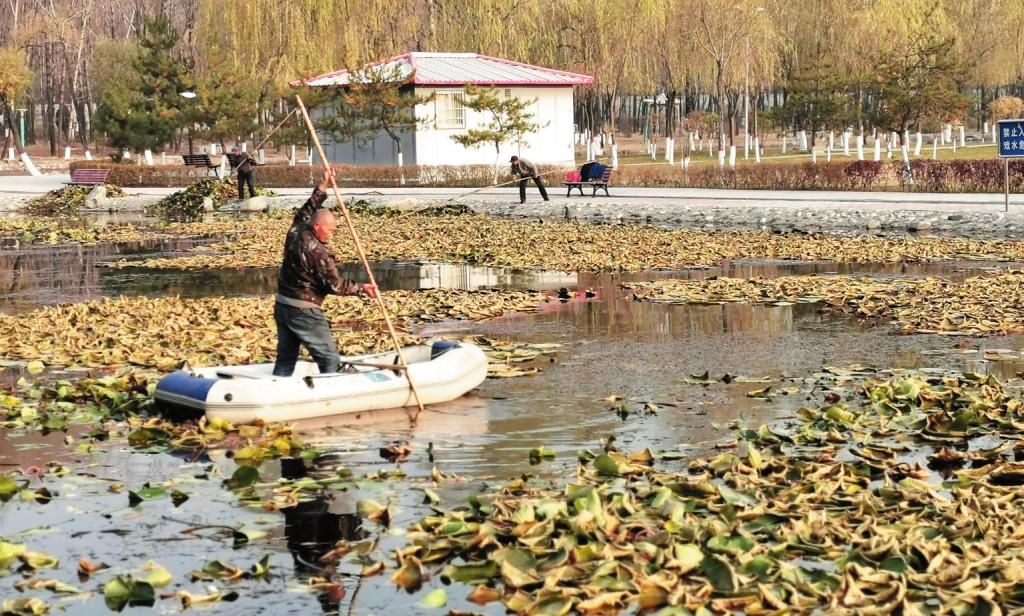 近日,五臺(tái)縣園林工人在濕地公園打撈水面上的垃圾和落葉。入冬以來(lái),天氣漸冷,葉落花謝,五臺(tái)縣適時(shí)啟動(dòng)水面清潔工作,打造凈水環(huán)境。(金俊賢 攝)