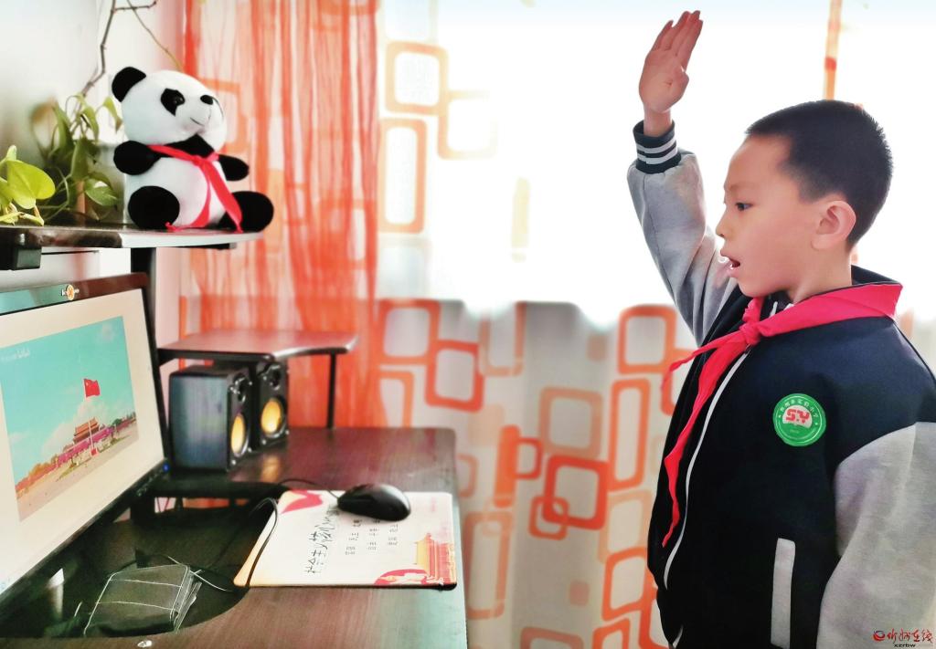 2月28日上午,在我市疫情防控的背景下,市實驗小學(xué)學(xué)生在家里準(zhǔn)時參加學(xué)校組織的線上升國旗儀式。圖為一名小學(xué)生隔著屏幕,向國旗敬禮。 (宮清華 攝)
