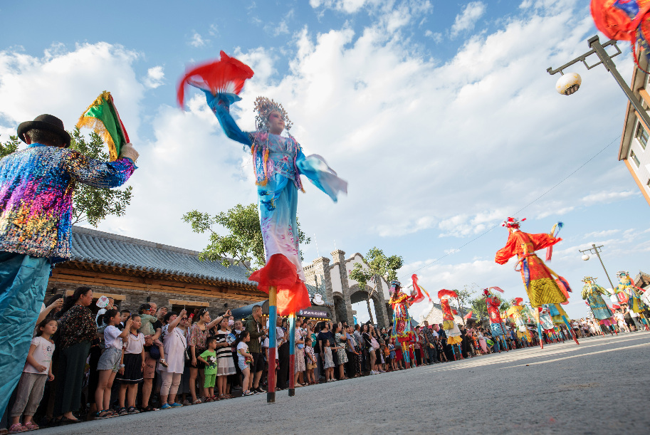 忻州古城東大街的文藝表演踩高蹺。新華網(wǎng)發(fā) 侯效平 攝