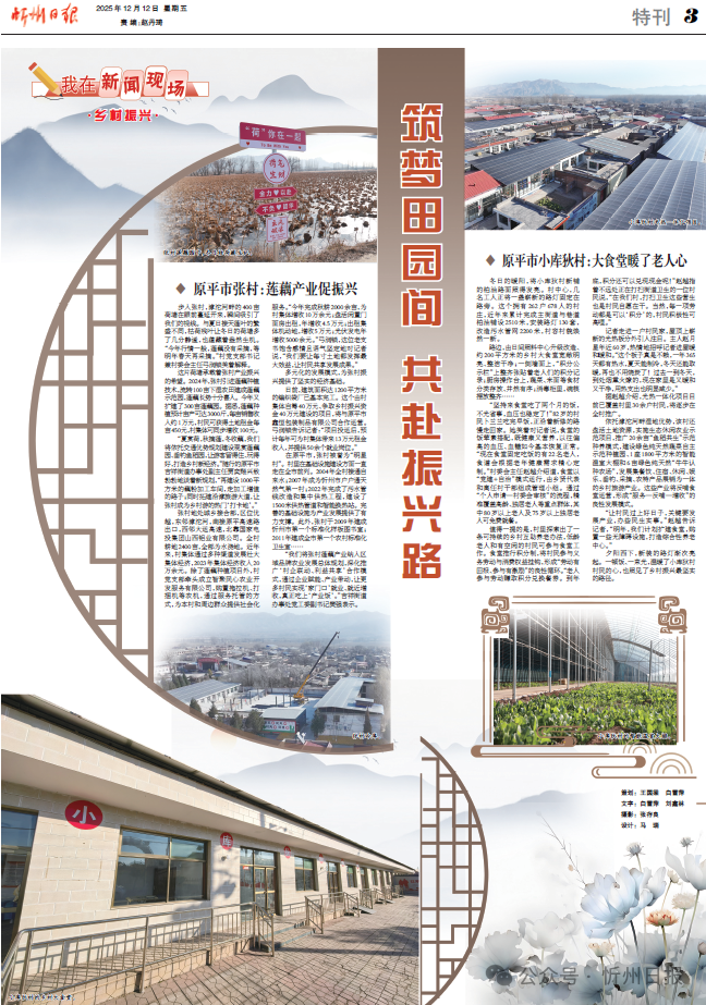 “夏賞荷,秋摘蓮,冬收藕,我們將依托交通優(yōu)勢規(guī)劃建設(shè)觀賞蓮藕園、垂釣魚稻園,讓游客留得住、玩得好,打造鄉(xiāng)村新經(jīng)濟(jì)?!彪S行的原平市吉祥街道辦事處副主任賈奕翔興致勃勃地談著新規(guī)劃,“再建設(shè)1000平方米的藕粉加工車間,走加工增值的路子;同時拓建沿滹旅游大道,讓張村成為鄉(xiāng)村游的熱門‘打卡地’?!?/p>