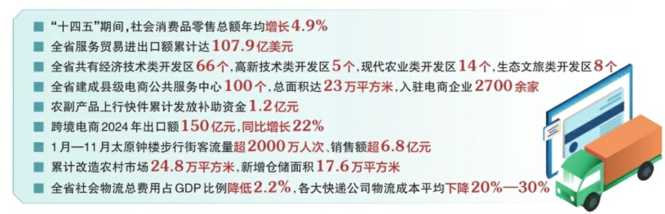 數(shù)字顯示,“十四五”期間,社會(huì)消費(fèi)品零售總額年均增長4.9%,建成100個(gè)鄉(xiāng)村e(cuò)鎮(zhèn),打造了大同黃花等113個(gè)區(qū)域公用品牌。農(nóng)產(chǎn)品上行快件補(bǔ)助帶動(dòng)約33億元農(nóng)產(chǎn)品銷售。實(shí)物商品網(wǎng)上零售額年均增長24.1%,高于全國17.1個(gè)百分點(diǎn)。