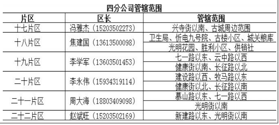 近期,忻州熱力有限公司收到很多用戶上門反饋,普遍反映客服熱線占線時(shí)間太長(zhǎng),無(wú)法及時(shí)反映供熱情況,導(dǎo)致用戶遇到供熱相關(guān)問(wèn)題或故障無(wú)法及時(shí)反饋。根據(jù)群眾目前遇到的困難,忻州熱力有限公司公布了22個(gè)供熱片區(qū)及負(fù)責(zé)人聯(lián)系方式,以便用戶及時(shí)反饋。