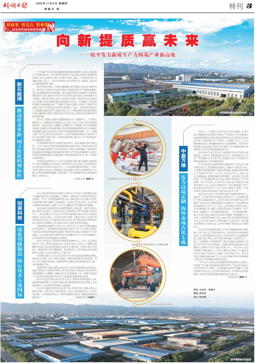 從攻克關(guān)鍵技術(shù)到布局未來產(chǎn)能,冠榮科技以創(chuàng)新為楫,以智造為帆,正成為忻州推動(dòng)新型工業(yè)化、培育新質(zhì)生產(chǎn)力的中堅(jiān)力量。正如楊淑榮所言:“唯有掌握核心技術(shù),才能在風(fēng)浪中行穩(wěn)致遠(yuǎn)?!保ū緢?bào)記者劉鑫林)