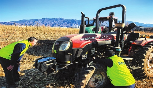 技術(shù)人員正對(duì)拖拉機(jī)進(jìn)行全面“體檢”。 郭婧蕾攝