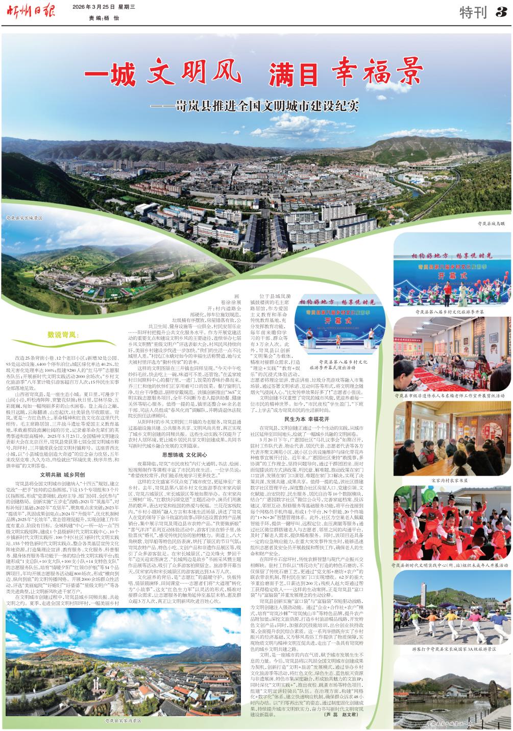 山西省岢嵐縣,是一座生態(tài)小城。夏日里,可漫步于山間小徑,聽松濤陣陣、賞繁花似錦;秋日里,層林盡染、五彩斑斕,宛如一幅絢麗多彩的山水畫卷。登上高山之巔,極目遠眺,云海翻涌、山巒起伏,壯美景色盡收眼底。岢嵐,更是一方紅色熱土,革命精神和紅色文化在這里代代相傳。毛主席路居館、三井戰(zhàn)斗遺址等愛國主義教育基地,承載著那段波瀾壯闊的歷史,記錄著革命先輩們的英勇事跡和崇高精神。2025年5月23日,全國精神文明建設表彰大會在北京召開,岢嵐縣榮獲第七屆全國文明城市稱號,陽坪村、三井鎮(zhèn)榮獲全國文明村鎮(zhèn)稱號。這座晉西北小城,以“小縣城也能創(chuàng)造大奇跡”的信念奮力攻堅,五年來攻堅克難、久久為功,終繪就出“環(huán)境優(yōu)美、秩序井然、和諧幸?!钡奈拿鞔鹁怼?/p>