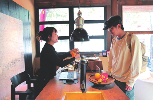 在忻州古城“聽初”民宿,店長朵朵正在為住客辦理入住業(yè)務(wù)。 暢 雪 張 媛攝