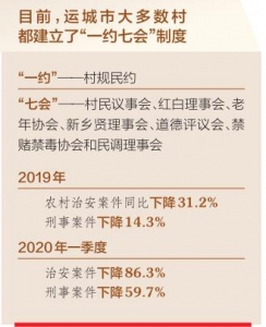 目前,運(yùn)城市大多數(shù)村都建立了“一約七會”制度——“一約”是村規(guī)民約,“七會”是村民議事會、紅白理事會、老年協(xié)會、新鄉(xiāng)賢理事會、道德評議會、禁賭禁毒協(xié)會和民調(diào)理事會。這“一約七會”制度的不斷健全,對破除鄉(xiāng)村社會陋習(xí)、引導(dǎo)群眾移風(fēng)易俗、引領(lǐng)社會新風(fēng)、化解矛盾糾紛,維護(hù)基層社會和諧穩(wěn)定起到了重要作用。村民的正能量多了,鄉(xiāng)村的負(fù)面事情少了,社會治安狀況得到明顯改善,群眾安全感顯著增強(qiáng)。2019年運(yùn)城市農(nóng)村治安案件同比下降31.2%,刑事案件下降14.3%;2020年一季度,治安案件下降86.3%,刑事案件下降59.7%。
