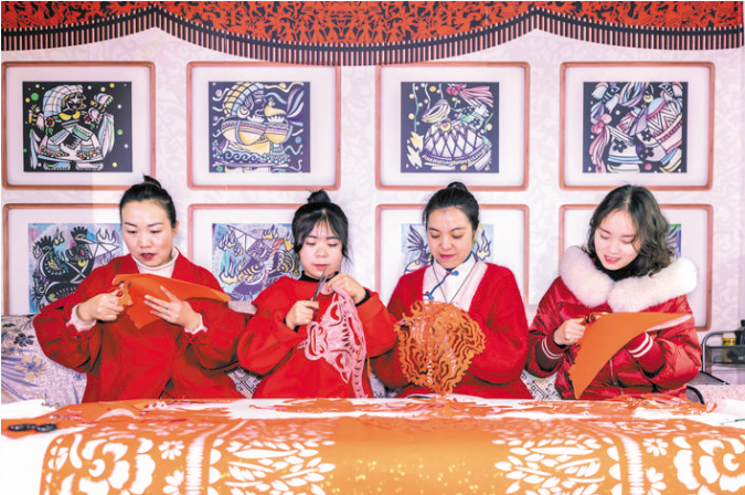 1月17日,岳紅霞(右二)帶領(lǐng)工作室學(xué)員創(chuàng)作“金牛送?!奔艏?。近日,曾獲全國(guó)剪紙大賽“金剪刀獎(jiǎng)”、貴州省畢節(jié)市黔西縣非遺傳承人岳紅霞帶領(lǐng)工作室學(xué)員創(chuàng)作“金牛送福”系列主題作品,迎接農(nóng)歷牛年。 (新華社發(fā) 范暉 攝)