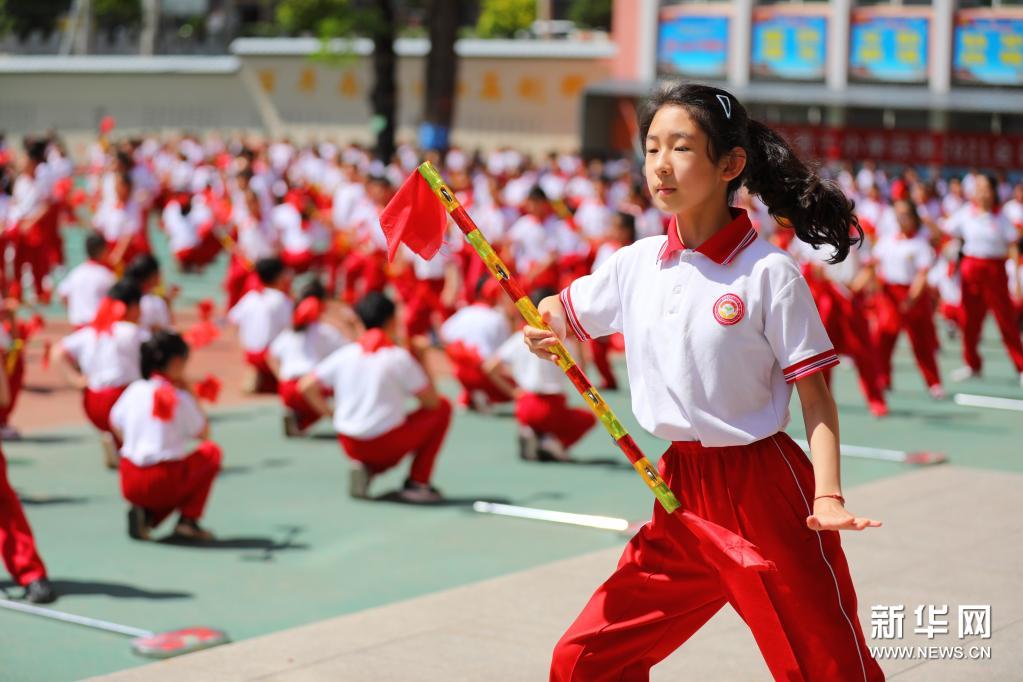 6月10日,在承德市雙橋區(qū)南營子小學(xué),學(xué)生在大課間上練習(xí)“霸王鞭”。近年來,河北省承德市雙橋區(qū)南營子小學(xué)以開展“陽光大課間”為平臺,將非遺民間舞蹈“霸王鞭”融入學(xué)校素質(zhì)教育實(shí)踐中,通過聘任專業(yè)老師,開設(shè)“霸王鞭”體育運(yùn)動社團(tuán),引導(dǎo)小學(xué)生在大課間上練習(xí)“霸王鞭”,增強(qiáng)體質(zhì),傳承非遺。新華社發(fā)(劉環(huán)宇 攝)