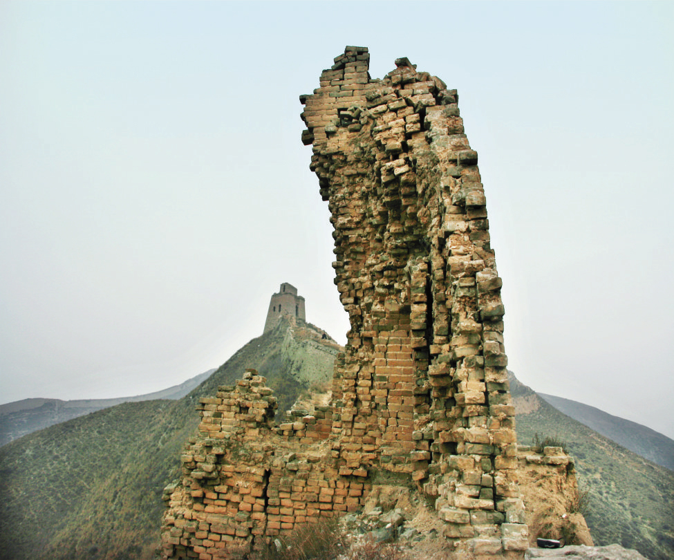 碑文前4行記述了明代萬歷三十八年(1610年)三月到五月修筑猴兒山以東山石墻一百丈,高二十層。萬歷三十九年(1611年)三月到八月修筑磚墻和敵樓3座,3座敵樓分別命名為“保華”、“拱華”、“鞏華”。兩年修筑長城總長二百九十七丈三尺,長城墻體連垛口總高三丈,頂寬一丈五尺。查找文物出版社《山西省明長城資源調查報告》第十二章代縣長城(1275—1279頁),此次發(fā)現(xiàn)碑記的6號敵臺位于白草口1段長城上,敵臺券門上方嵌砌的敵臺名稱碣石已被破壞無存,碑文所記修筑3座敵樓極有可能為白草口1段長城4號、5號、6號敵臺。所計墻體高連垛口三丈、頂闊一丈五尺與調查報告記錄的墻體高度6.2—8.2米、垛口高1.4米、頂部殘寬2.2—4.2米相近。代縣白草口1段長城北接朔州市山陰縣新廣武長城3段,新廣武長城3段16、17、18、19號敵臺保存完好,券門上方嵌砌的碑碣均刻有“萬歷丙午中秋之吉、巡撫都御史李景元”文字,萬歷丙午為萬歷三十四年(1606年),說明代縣白草口1段長城修筑時間比朔州市山陰縣新廣武長城3段晚了4年。
