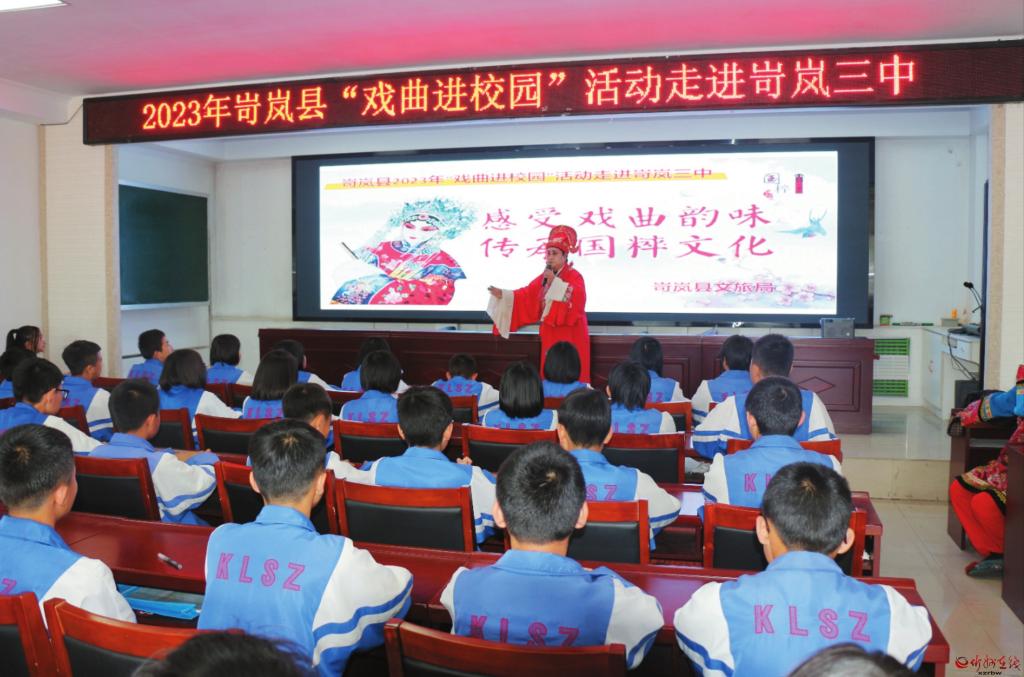 “樊梨花她好比鮮花一樣,練就了一套套飛龍花槍……”67歲的岢嵐縣晉劇團(tuán)退休演員王潤(rùn)花給岢嵐三中的同學(xué)們演繹晉劇《樊梨花》片斷,圓潤(rùn)的唱腔加上演員的專業(yè)表演,引來(lái)臺(tái)下學(xué)生們的嘖嘖贊嘆;53歲的本土二人臺(tái)演員王藝文表演的《探親》選段,更是以生動(dòng)、詼諧的表演和極富地方生活氣息的臺(tái)詞讓同學(xué)們投去欽佩的目光……當(dāng)演員們表示要現(xiàn)場(chǎng)教大家“比劃”時(shí),同學(xué)們爭(zhēng)相上臺(tái)跟著學(xué)起來(lái)。這是近日岢嵐縣2023年“戲曲進(jìn)校園”活動(dòng)走進(jìn)岢嵐三中的場(chǎng)景。