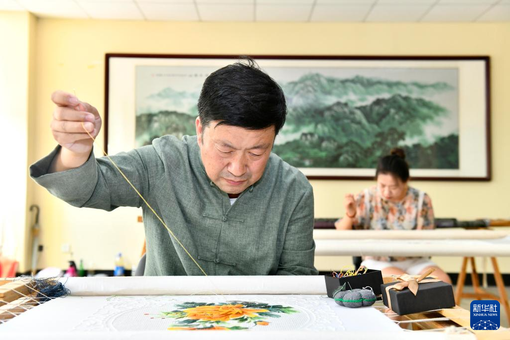 7月19日,在威海市文登區(qū)魯繡非遺工坊,非遺傳承人田世科在繡制魯繡作品。