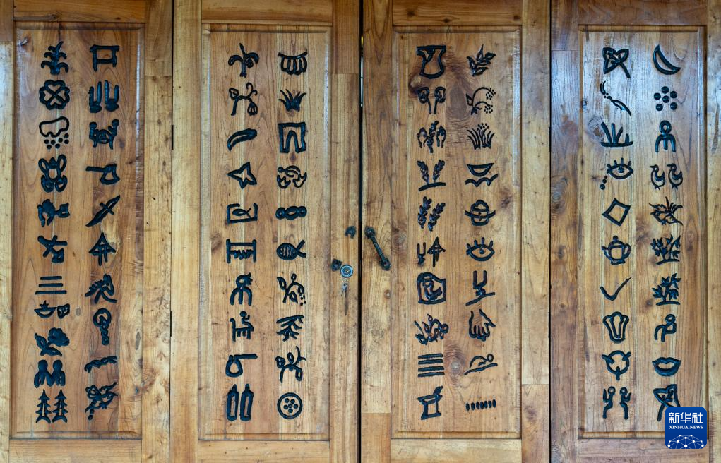這是7月30日拍攝的刻在坡芽村坡芽傳習(xí)館門(mén)板上的81個(gè)“坡芽情歌”圖畫(huà)符號(hào)。