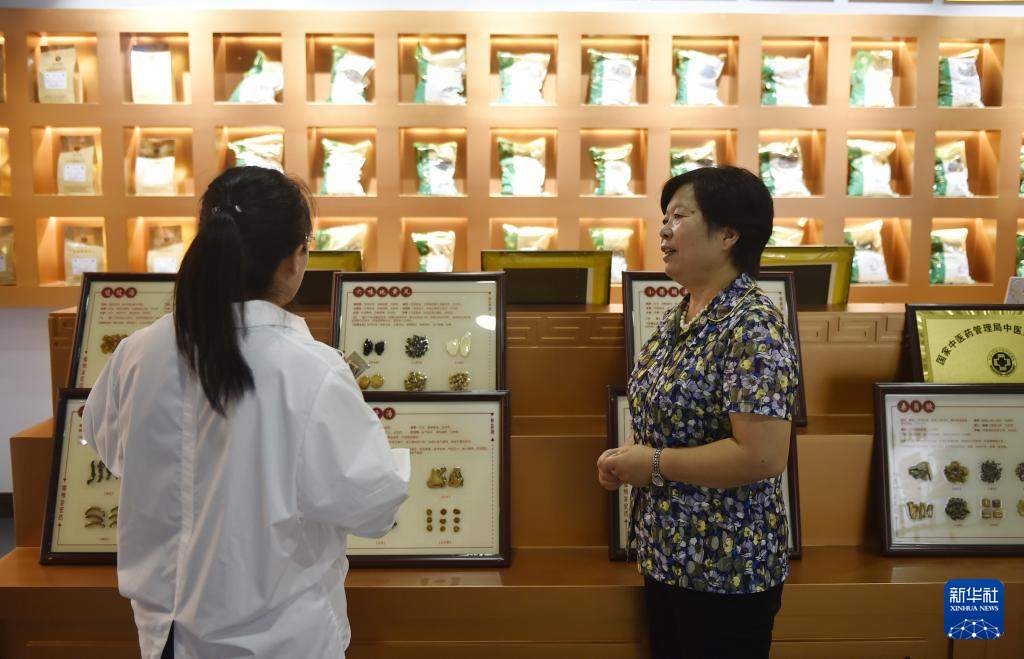 8月4日,在禹州中醫(yī)藥文化技藝傳習(xí)館,非遺項目“禹州中藥加工炮制技藝”代表性傳承人朱改蓮(左)向參觀者介紹中藥材知識。