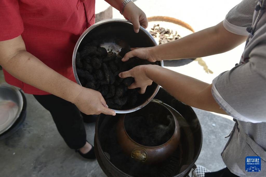 8月4日,在禹州中醫(yī)藥文化技藝傳習(xí)館,非遺項目“禹州中藥加工炮制技藝”代表性傳承人朱改蓮(右)展示中藥材“九蒸九曬”加工技藝。