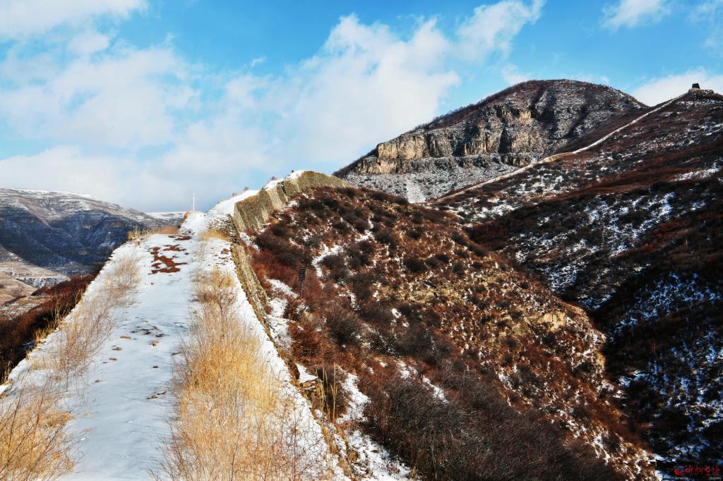 另一道長城是這樣的:史書上記載的宋長城出發(fā)地是草城川口天澗堡,實地中的草城川現(xiàn)在叫北川河,天澗堡古代可能有堡墻,如沒有,不可能有“川口有古城”的記載,可能歷經(jīng)千余年風(fēng)雨被河水沖刷掉了,現(xiàn)在堡墻已不太明顯但有古文化層遺跡,還有兩座規(guī)模較大的烽火臺。長城從此出發(fā),向東爬上陡坡,順著一道山洼上到山頂。在山頂走了一公里余就與從興縣西來的北齊、隋修筑的早期長城匯合,在陡峭的山頂上形成一個完美的“岢嵐結(jié)”,也就是俗話中的“二把叉”形狀。這段宋代獨立修筑的長城大約有3公里。