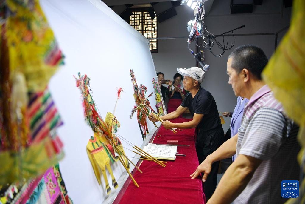 9月16日,皮影戲藝人在玉田縣“非遺會(huì)客廳”皮影工坊內(nèi)表演皮影戲。