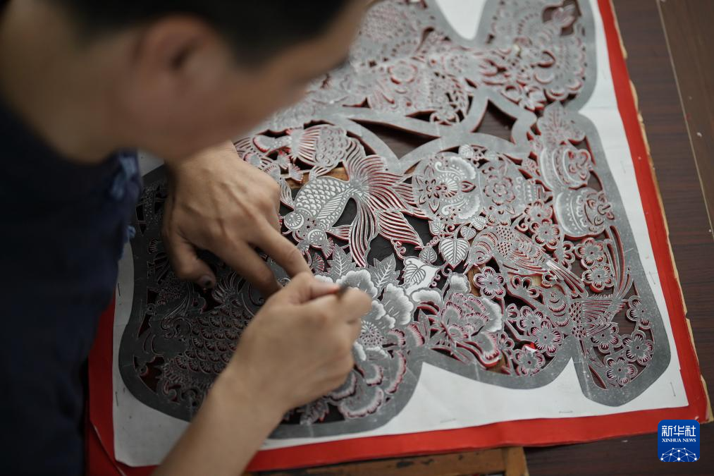 9月16日,剪紙藝人在玉田縣“非遺會(huì)客廳”工作室內(nèi)創(chuàng)作剪紙作品。
