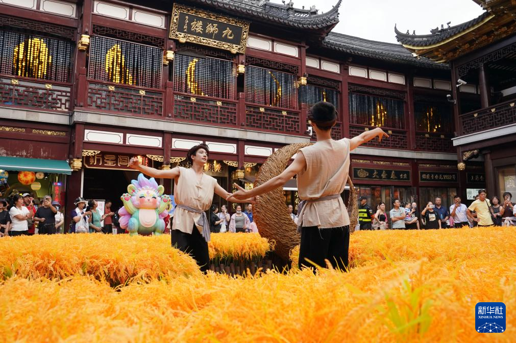9月17日,游客在豫園商城“豐收的麥田”場(chǎng)景中,欣賞演員表演豐收舞。
