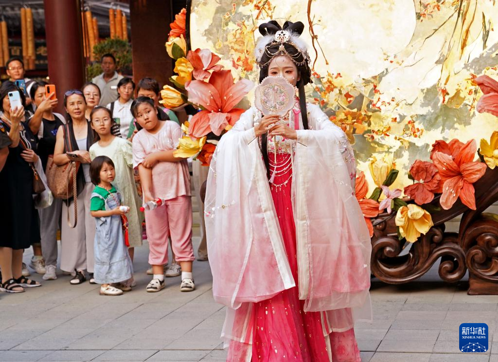 當(dāng)日,作為“2023上海旅游節(jié)”系列活動(dòng)之一,豫園商城2023“仲秋月神游”活動(dòng)正式啟幕。即日起至9月28日,游客可在中秋主題的互動(dòng)場(chǎng)景中,游園賞月,欣賞演出,參與互動(dòng),共賞古風(fēng)佳節(jié)浪漫,共享傳統(tǒng)文化之美。新華社記者 劉穎 攝