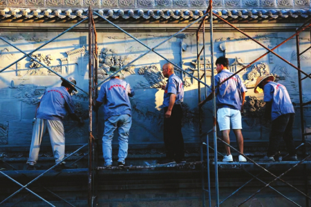 溫建明帶領(lǐng)團(tuán)隊(duì)為榆次什貼古鎮(zhèn)創(chuàng)作160米的《晉商萬里茶道》大型磚雕文化墻。