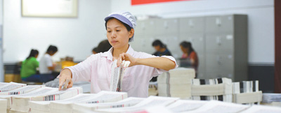安徽省涇縣三希堂線裝文化園,工人正在原大影印摛藻堂本《欽定四庫全書薈要》生產(chǎn)線上忙碌。