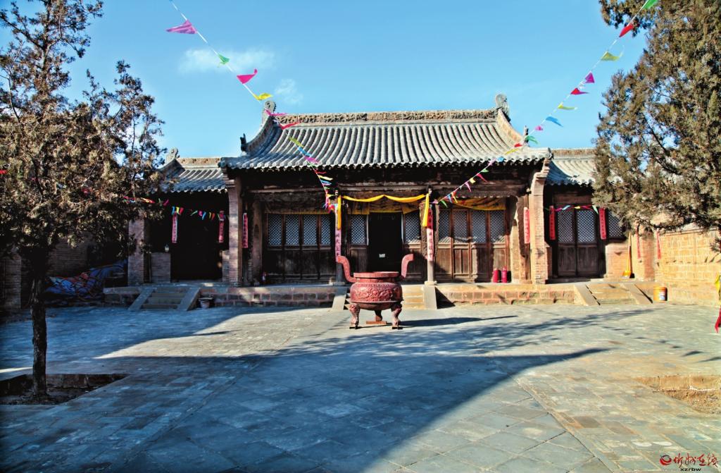 關(guān)帝廟:現(xiàn)存建筑有磚砌山門1座,面寬一間,硬山頂;左側(cè)鐘樓,基座石砌,中有窯洞,上部木構(gòu),硬山頂。正殿為關(guān)帝殿,面寬三間,進深三椽,硬山頂,斗拱一斗二升交麻葉,耍頭云形,龍首,象鼻,三間均安格扇門;殿內(nèi)合榻,木雕水波形,神龕內(nèi)供關(guān)云長;殿內(nèi)東西壁滿繪清代三國演義壁畫48幅,共計31平方米。正殿左右各有一間小屋,進深二椽,硬山頂,格扇門,格扇窗,為僧舍。院東小殿一間,硬山頂,斗拱一斗二升交麻葉。