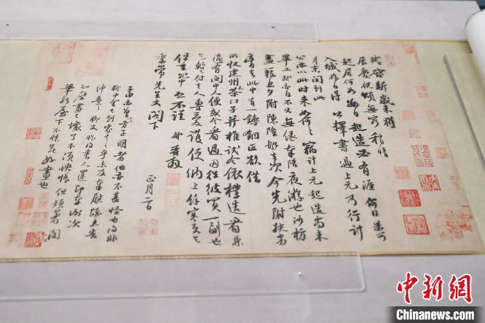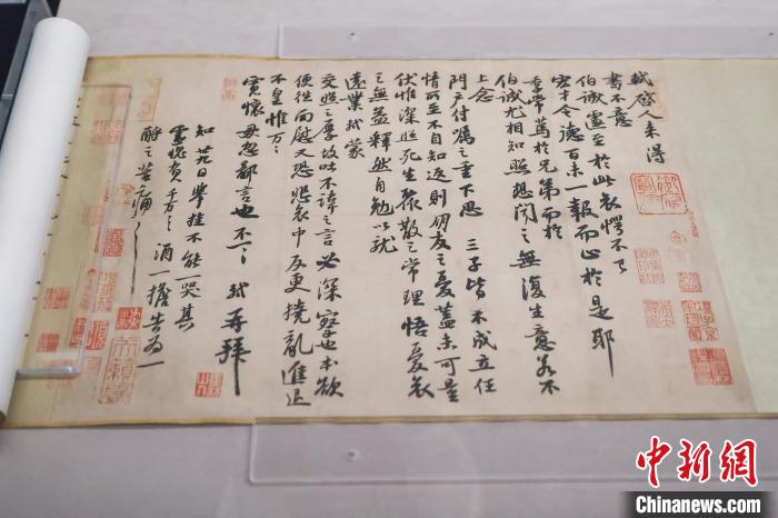 近日,“千古風(fēng)流 不老東坡——蘇軾主題文物展”在海南省博物館舉行。圖為展出的蘇軾真跡《人來得書帖》。 中新社記者 駱云飛 攝