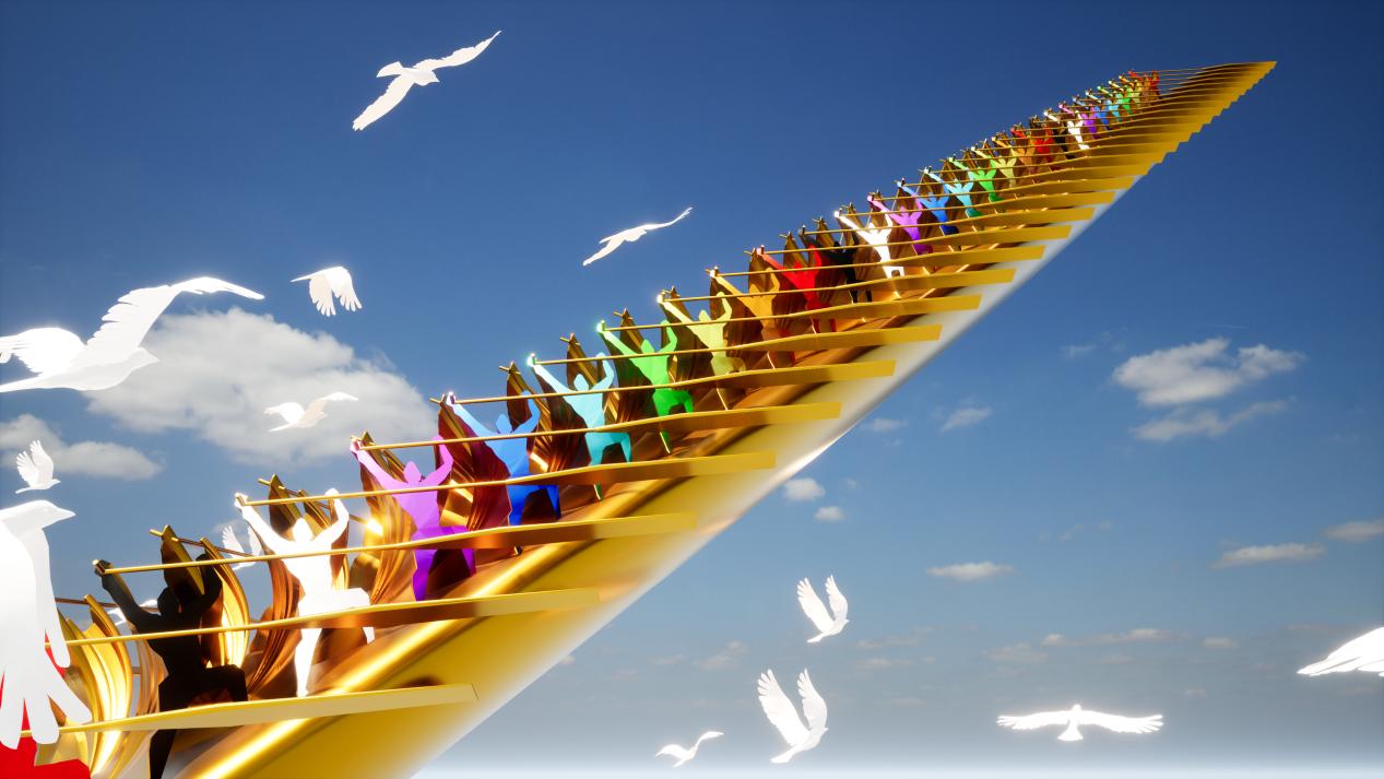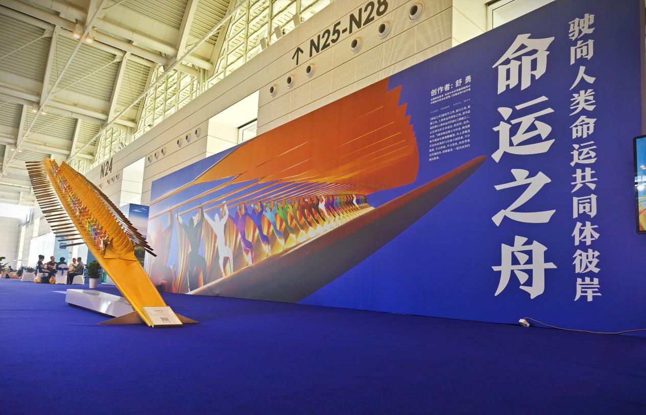 《命運之舟》雕塑作品以巨輪、龍舟、方舟、飛船的象征意義與形態(tài),概括提煉為國際化新圖騰雕塑,舟上迎著藍天劃向未來的72位奮力劃槳者,不分國度、不分種族、不分膚色,這是世界人民風雨同舟、命運共同的象征。其宏偉的規(guī)模、深刻的寓意和精湛的藝術手法,成為本次文旅博覽會的一大亮點。