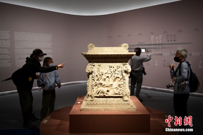 資料圖:參觀者觀看展品《祭拜瑪爾斯、維納斯和西爾瓦諾斯的圣壇》。中新社記者 田雨昊 攝