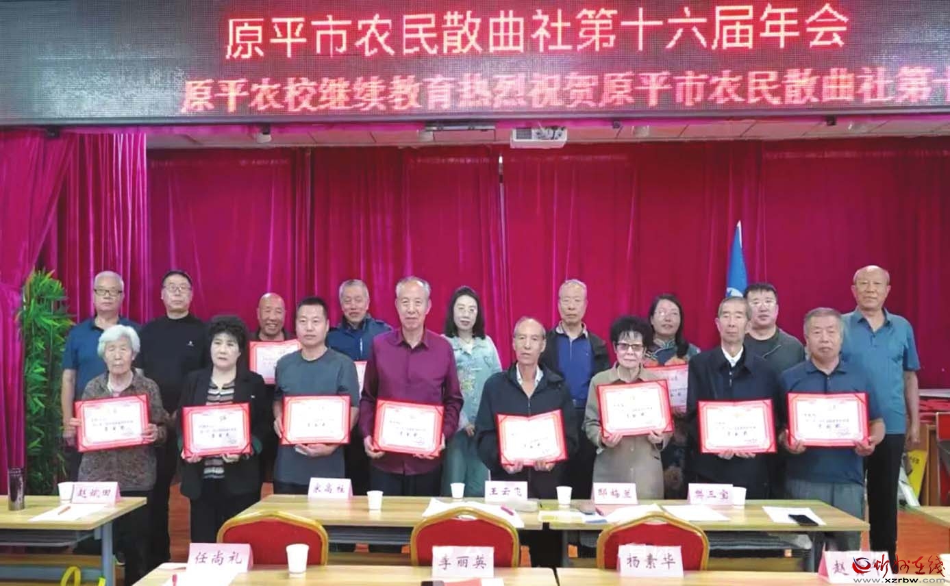 散曲社朗誦部的曲友們?cè)谟茡P(yáng)音樂(lè)聲中,激情澎湃地朗誦著五谷飄香的農(nóng)民散曲,20多名優(yōu)秀社員受到表彰,展示出原平農(nóng)民散曲的喜慶豐收景象?!霸?shī)如潮,農(nóng)民種曲名聲在,情如火,南腔北調(diào)心澎湃。曲如海,同舟共濟(jì)承傳愛(ài),暖如春,一年四季花不敗。花開(kāi)滿地鮮,曲韻熔天籟,好一個(gè)震驚曲界田園派?!边@首散曲《正宮·塞鴻秋》道出了散曲社社員們的心聲。