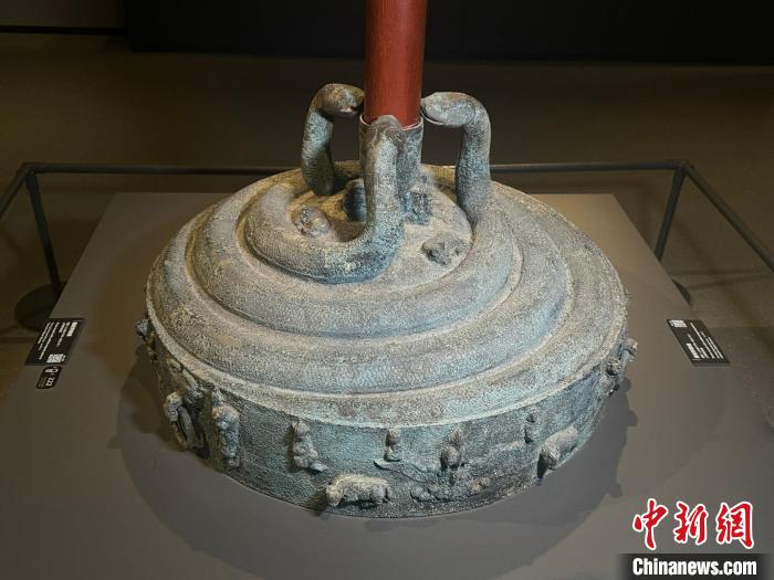 1月22日至3月2日,山西青銅博物館推出 “靈蛇獻瑞——乙巳蛇年生肖文物大聯(lián)展”。圖為戰(zhàn)國盤蛇鼓座。 中新社記者 楊靜 攝