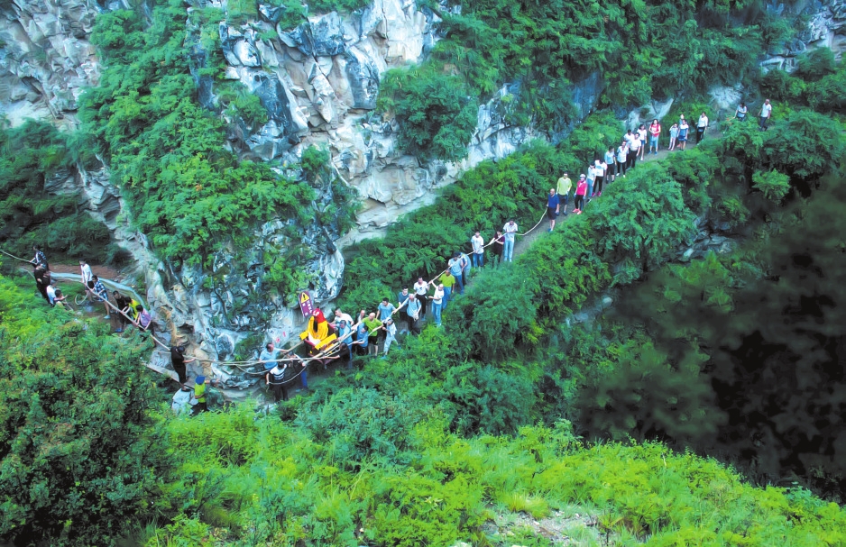 上山的路越來越難走,也越來越危險。前方是峭壁,只容一人通過,腳下便是萬丈深淵,一旦失足,后果難料。女士們有點害怕。朱部長一邊鼓勵,一邊教她們要領(lǐng):踩實、抓穩(wěn)、不要向下看。前面幾位戰(zhàn)戰(zhàn)兢兢相繼通過,最后一位女士微胖,滿臉汗珠,雙腿打顫,人們都為她捏了一把汗,好在有驚無險。