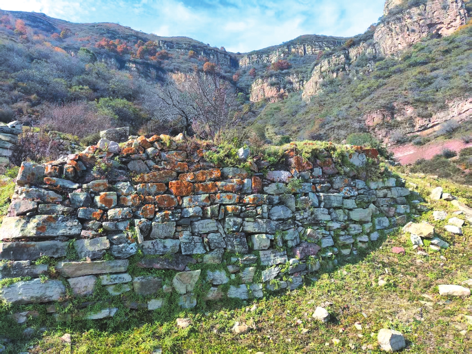 坡道在不斷升高,玉皇峁進(jìn)入我們的視野。在玉皇峁的腳下,我們看到了一處貌似村落的遺址,有磚石瓦礫散落,有殘存的石砌墻垣,有石頭筑堰的小塊梯田……玉皇峁村是一個自然村,但不知建于何時,亦不知廢于何時。玉皇峁村的故事,早已消逝在千百年的煙云中,我們無法還原往昔歲月里的真相。