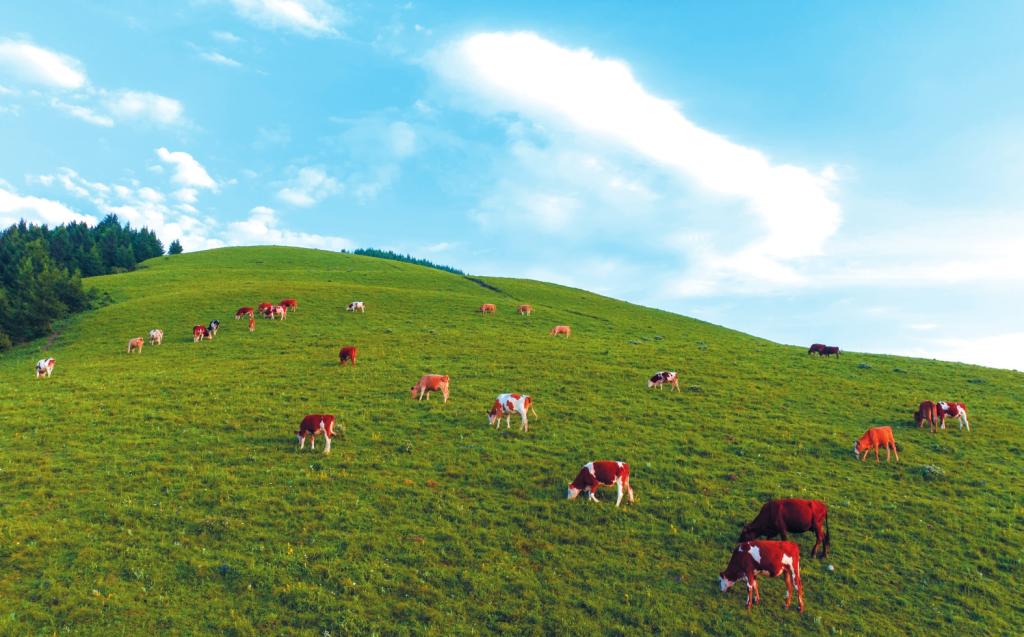 夏之爽,清涼自生的愜意。當(dāng)酷暑的熱浪在平川上肆虐,金山梁卻以其巍峨的身軀,將喧囂與燥熱溫柔地阻擋在外。這里平均氣溫較山下低五六攝氏度,即便是最難熬的三伏天,氣溫也鮮少超過二十?dāng)z氏度,儼然一處天賜的清涼福地。廣袤的草甸是它獻(xiàn)給夏日最柔軟的綠毯,厚實(shí)、松軟,綿延至天際。成群的牛羊散臥其間,安然地啃食著青草。成片的松林則是它撐開的巨傘,郁郁蔥蔥,遮天蔽日。風(fēng)過處,松濤涌動(dòng),那低沉而富有磁性的回響,為靜謐的夏日注滿了深邃的生機(jī)。放眼四野,胡麻花成片怒放,匯成藍(lán)色的波浪,仿佛要與天際相接;土豆花則素雅地點(diǎn)綴在田間,潔白的花瓣鑲嵌在青色的田疇上。采藥人身影靈動(dòng),穿行于榛莽之間,背后的簍子里,黃芪、柴胡