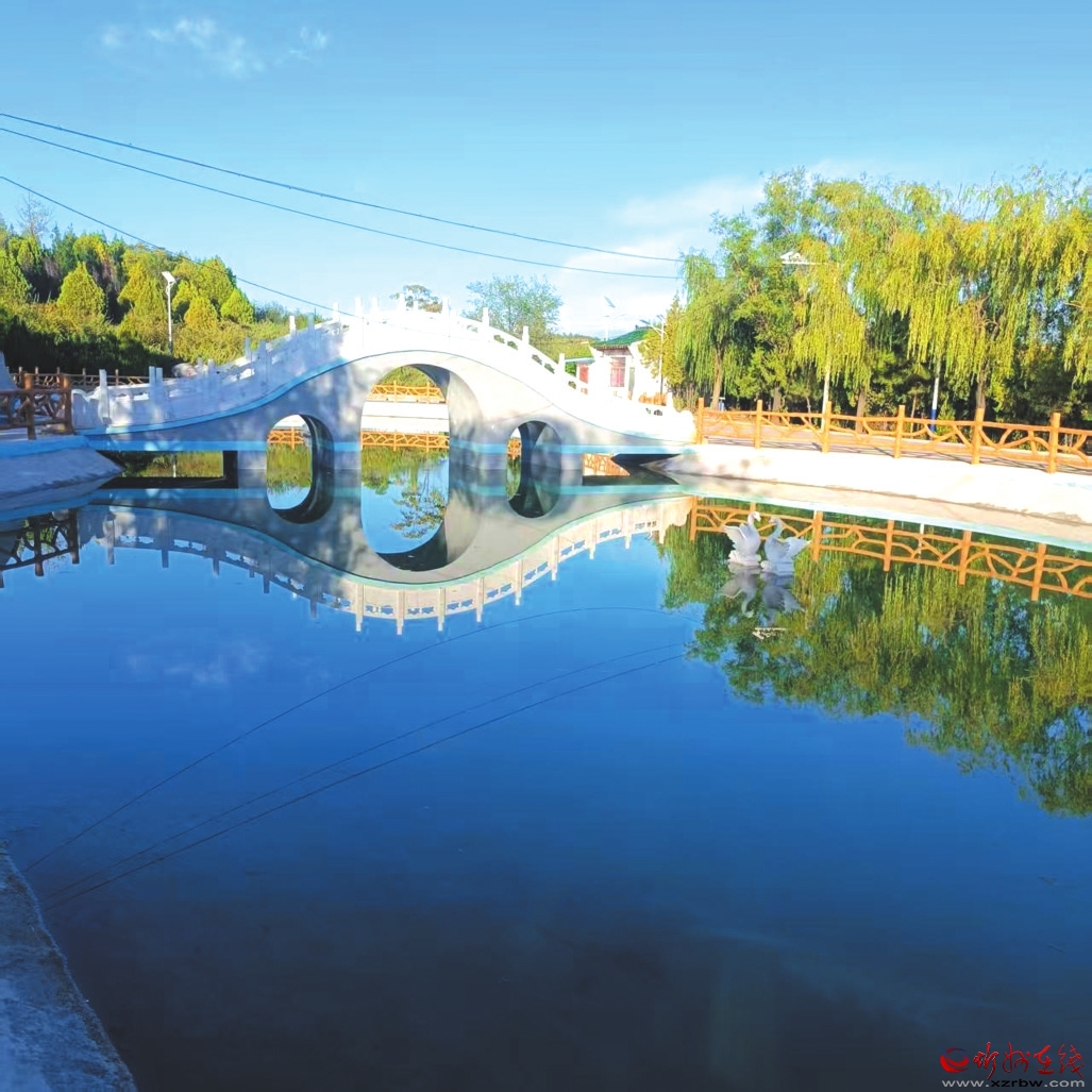 沿路而下,過橋爬坡,便到了天鵝湖。誰能想到,這碧水涵虛的景致,原是當(dāng)年造林蓄水的大水坑?工程完工后順勢修整,竟成飛龍山又一勝景。天鵝湖呈葫蘆狀,漢白玉拱橋橫跨腰間如玉帶,橋東石雕飛龍昂首欲飛,橋西石雕雙鵝戲水憨萌。湖水清澈見底,倒映藍(lán)天白云綠樹,風(fēng)過時漣漪擴散,美得讓人心醉,連時間都慢了下來。
