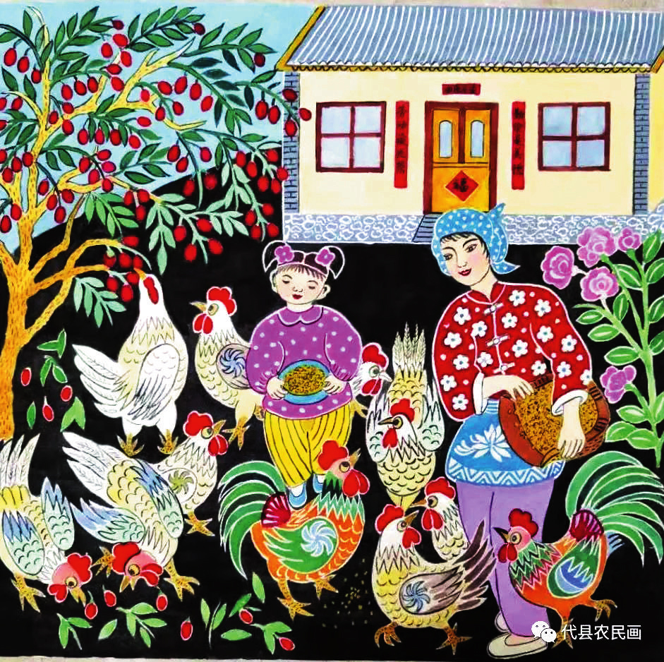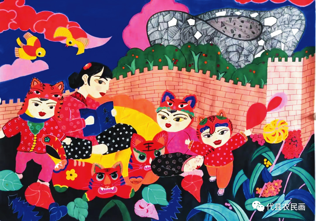 中國歷史文化名城代縣,文化底蘊深厚,民俗傳統(tǒng)技藝精巧別致,1988年和2008年先后被文化部授予“中國民間繪畫畫鄉(xiāng)”“中國民間文化藝術(shù)之鄉(xiāng)”。該縣的農(nóng)民畫早在上世紀80年代初就在全國產(chǎn)生過較大影響,之后經(jīng)歷了一段低迷期。近年來在代縣農(nóng)民畫促進會的推動之下,農(nóng)民畫又重新煥發(fā)出耀眼的光彩。先后涌現(xiàn)出多位畫家,其中尤以丁全愛、戴翠平、祁磊、賈永花、郎冬梅等18位女畫家組陣的雁門巾幗,在多年鉆研繪畫技巧的基礎(chǔ)上,創(chuàng)作出一幅幅特色鮮明、獨具匠心的畫作,成為閃耀三晉大地的矩陣,為傳承、弘揚雁門文化做出了新貢獻。