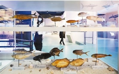 圖為參觀者在海洋展區(qū)一個魚類標本展柜前駐足觀看。新華社記者 方 喆攝