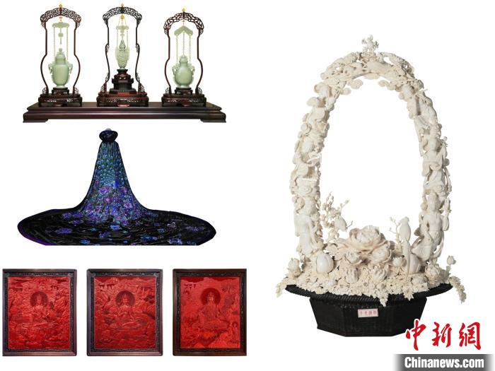 《纏枝蓮紋吊鏈瓶》(玉雕)、《四海升平》(牙雕)、《碧泓云想富貴長(zhǎng)天錦繡雀裘》(京繡)和《雕漆剔紅法海寺壁畫(huà)》(雕漆)四件作品被認(rèn)定為北京傳統(tǒng)工藝美術(shù)珍品。 主辦方供圖
