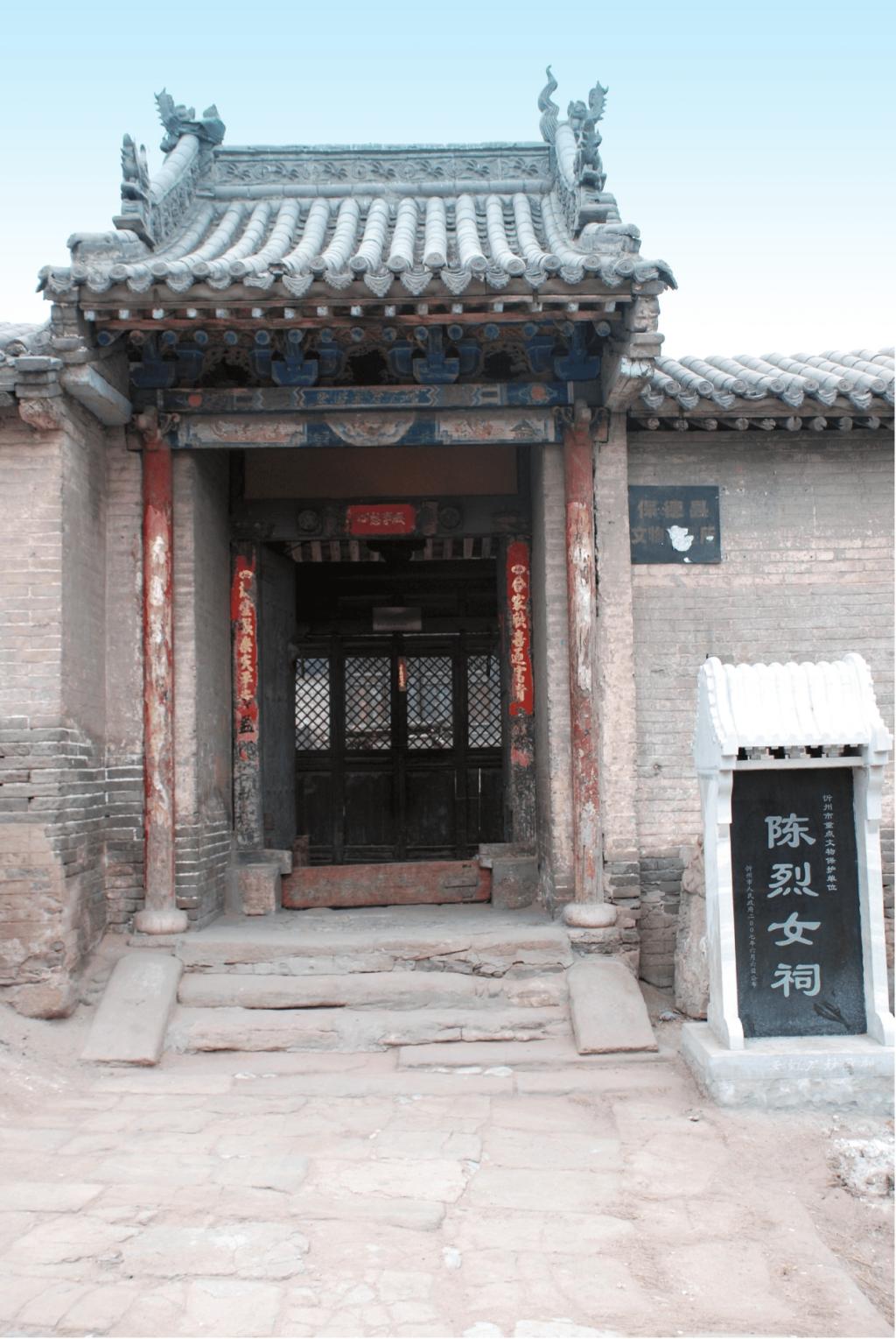陳烈女祠坐西向東,為二進院落布局。占地面積685平方米。大門一座,前院過殿面寬三間,單檐硬山頂;南北配殿各面寬三間,單檐硬山頂。后院正殿面寬三間,單檐硬山頂,前設(shè)小抱廈;后院正殿內(nèi)供奉陳烈女塑像。祠內(nèi)存有明崇禎七年(1634)“圣旨(復制品)”一道,新繪壁畫16平方米。2007年6月,陳烈女祠被忻州市人民政府公布為市級文物保護單位。
